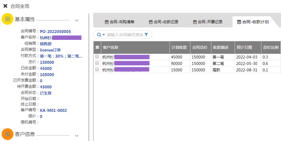 能對合同全局進行查看(如 采購清單、收款記錄、開票記錄、收款計劃等)